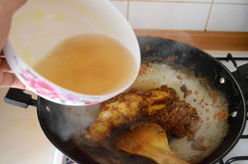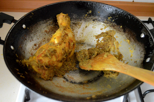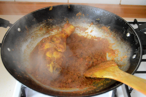 In a large wok heat oil and add the marinated chicken to sear on both sides. Once each side is evenly brown add the onion paste and cook until golden and fragrant.