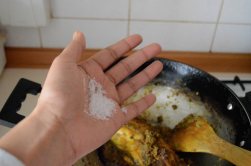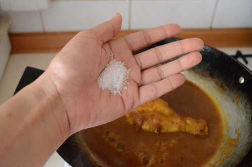 Add a half teaspoon of sugar to balance out the tastes. This won’t sweeten the curry. Cook and check for seasonings. Add salt if needed and let bubble away covered for at least 5 minutes.