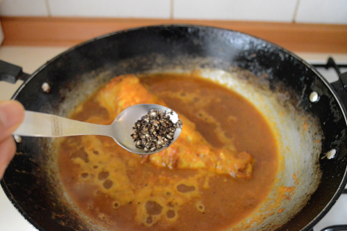 Once thickened add garam masala, salt and plenty of black pepper and stir well to combine