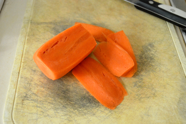 You want to slice your carrots in a way that they’re almost julienned, so begin by slicing them lengthwise