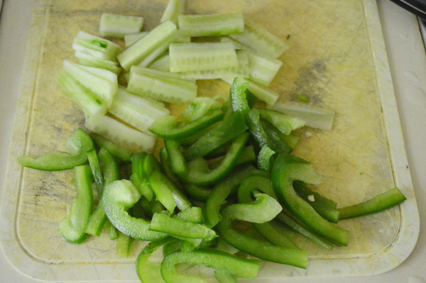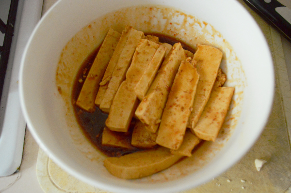 Slice vegetables into thin slices. Cut tofu into strips and marinate for 5-10 minutes. Heat some oil in a pan and gently place tofu strips until browned or lightly charred for a minute. Turn them over and after half a minute pour the marinting liquid in the pan. Let it bubble and thicken for another half a minute before turning off the heat. The tofu should be glossily bronzed on both sides.