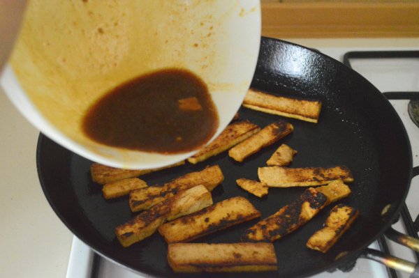 Before finally adding the marinating liquid the tofu sat in. Let it cook and bubble and get absorbed.