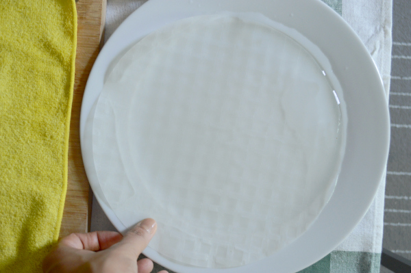 Begin by immersing the rice papers in water on both sides for a few seconds until the entire surface is wet but not wilting.