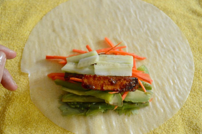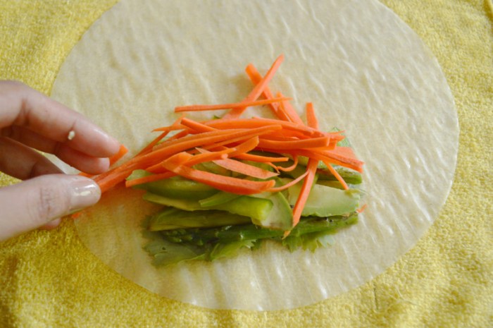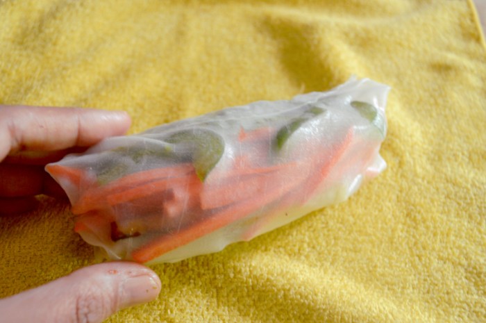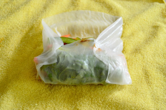 Once the vegetables are stacked, fold over the now soft and sticky rice paper once. Fold the opposite ends on the sides to stick over the first fold and roll again to seal the edges.