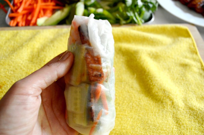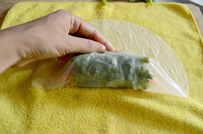 Next comes the rolling part where you gently but with purpose and intent enclose the vegetables in their transparent rice veil by folding the now very sticky rice paper over in a manner of wrapping.