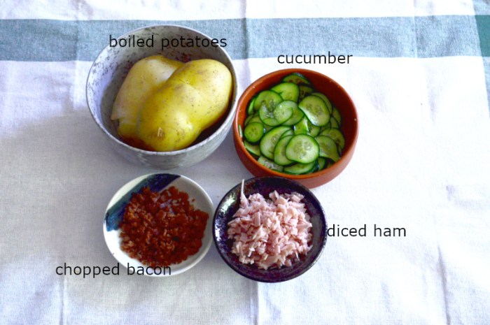 There is boiled potato, cooked bacon shopped into tiniest possible bits, chopped ham as tiny as can be managed, thin cucumber slices, salt and sugar (not pictured)