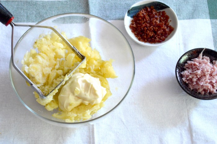 Peel and mash the potatoes until there are no lumps. Add in the mayonnaise and beat it in, Add the chopped bacon, ham and mix well again.