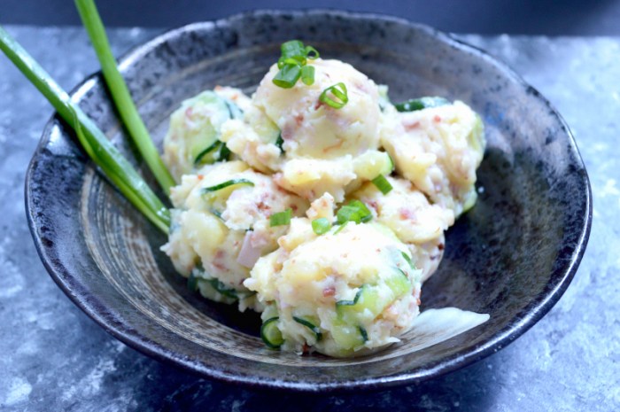 It was at a Japanese deli that I came across perfectly shaped ice cream scoops which upon further inspection turned out to be made of potatoes with bits of ham, bacon and cucumbers dotted about the perfect potato spheres and I absolutely had to buy some. It was different in a way that there was sweetness, some tang, and bites of chew courtesy the bacon alongside a refreshing crunch from the cucumbers and it was this interesting mingling of textures within the creamy heft of potatoes that made of me a complete convert.
