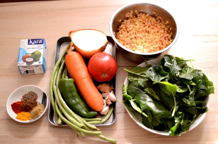 All you need are some vegetables of choice and here I have beans, carrots, spinach and pepper along with the very essential flavour base that’s made of onions, ginger, garlic and tomatoes. Also soaked lentils, coconut milk and turmeric, coriander powder, garam masala, red chilli powder and cumin seeds.