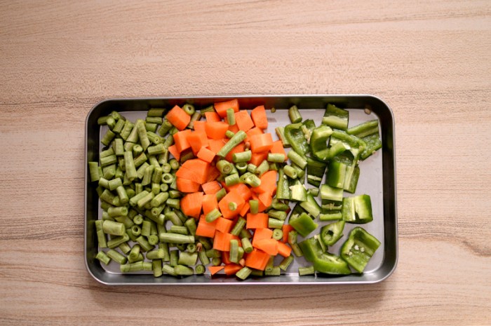 For the flavour base dice the tomatoes, onions, ginger and garlic and keep aside.