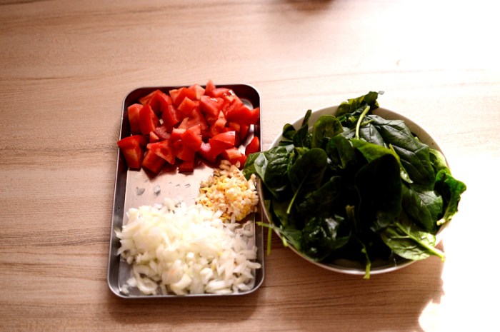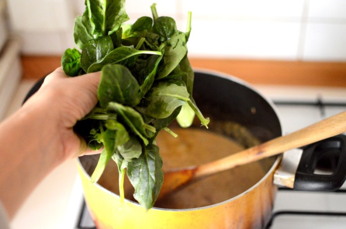 chop the vegetables into bite sized pieces and boil with soaked lentils until the lentils and vegetables are soft. Do not boil spinach along with the veg and lentils.