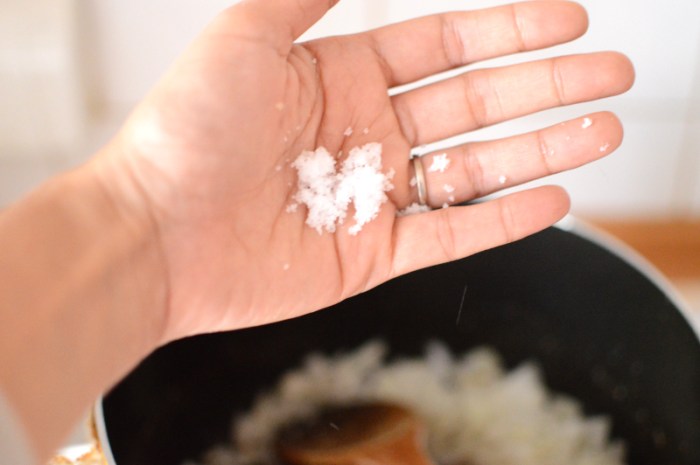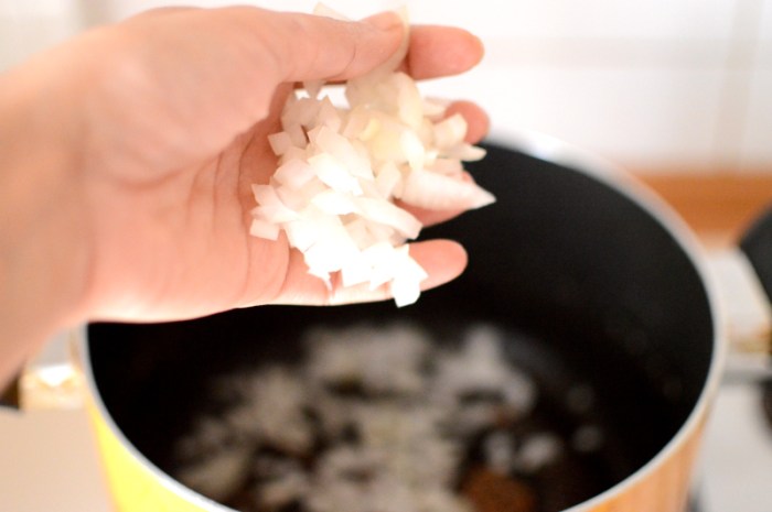 In a large pan heat some coconut oil and add the cumin seeds until they splutter. Add chopped onions and some salt and cook until the onions are golden brown in colour. Add ginger and garlic and cook until the garlic no longer smells raw. (roughly a minute). Add in the chopped tomatoes along with the spices and cook until the tomatoes have softened.