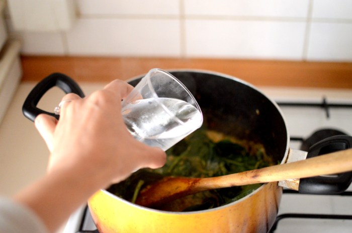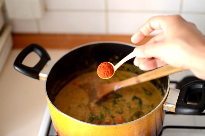 Pour in the coconut milk and let it simmer before finally adding in the spinach if using. Add some water to thin out the curry and some more salt.