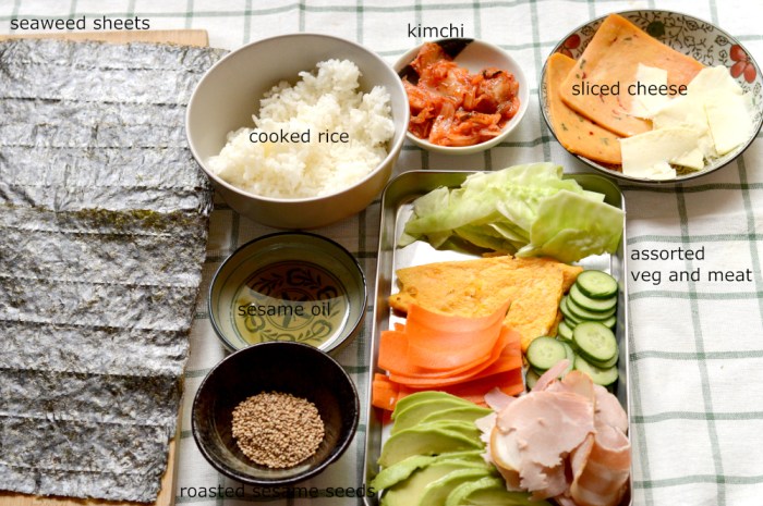 I have used here Nori sheets, sesame oil, cooked rice, roasted sesame seeds, kimchi, sliced cheese and some vegetables and ham