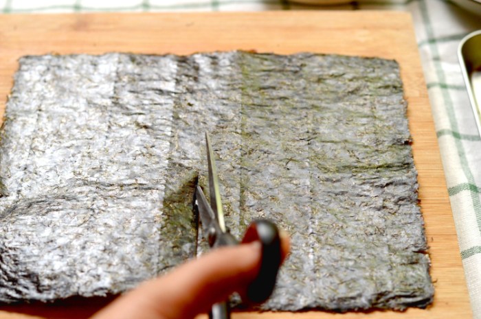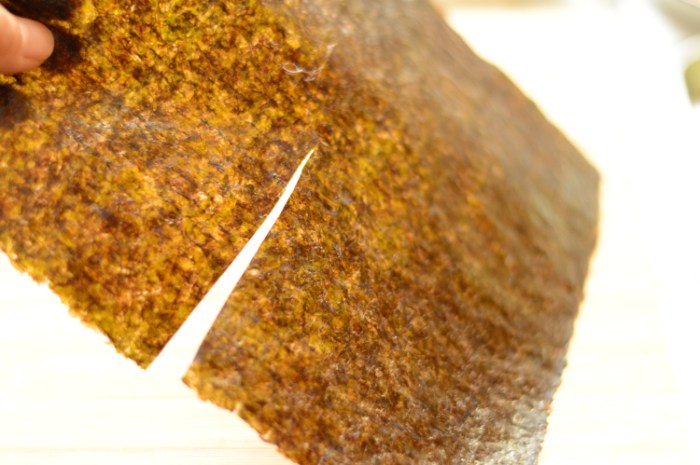 Recipe Instructions: Lay the nori sheet in front of you, its rougher surface facing the top and using a pair of sharp clean scissors, cut through the middle stopping halfway across.