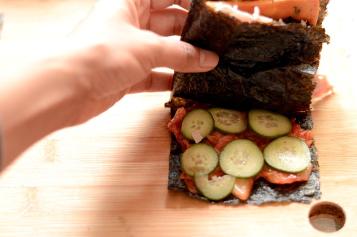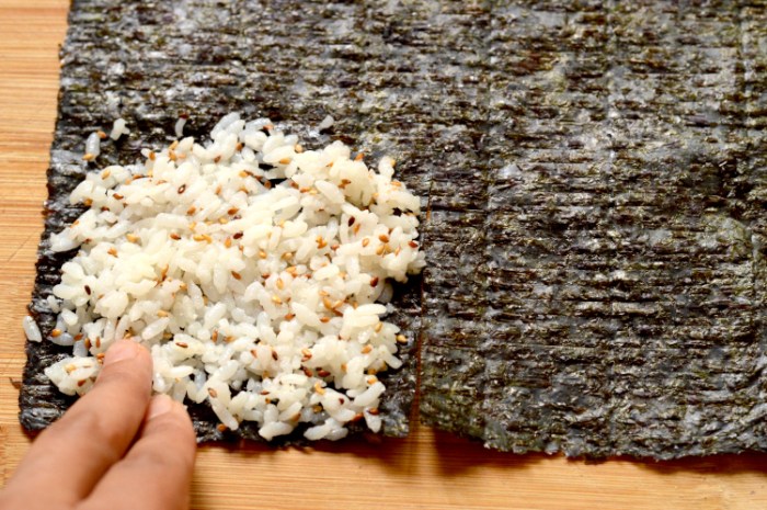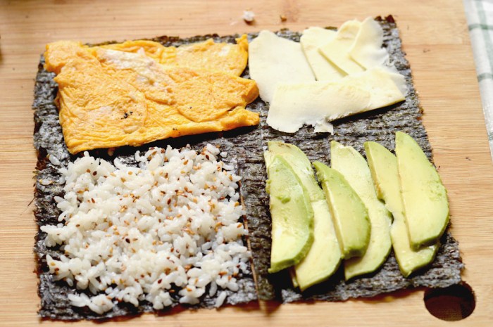 Add a thin layer of flavoured rice to the bottom left of the seaweed paper and continue adding a different ingredient to each part of the sheet. You should have four different ingredients. Fold over to top the bottom left portion of the sheet with a rice layer and continue to fold toward the right and then back to the bottom.