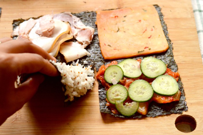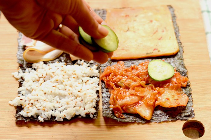 Start by adding a thin layer of rice to one part and creating a different flavour profile for each part. I have added here sliced ham, sliced cheese and kimchi with some cucumbers.