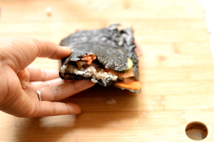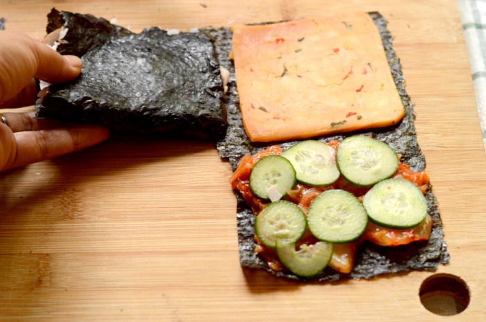 The list of ingredients can be as varied or as little as possible. You need nori sheets, sticky rice and any vegetable or meat of choice, preferably thinly sliced or shredded. I love using kimchi in this recipe for that salty-sweet pungent spicy taste but you can just as easily add some sriracha to your veg for a similar effect.