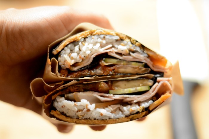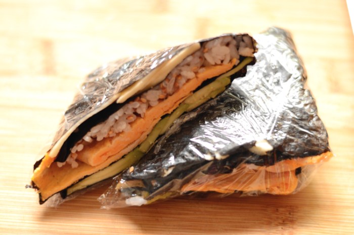 Folded kimbap! It looks like a brethren to the onigirazu and in a way, it is, except that this is a Korean version and in all probability, mine isn’t as authentic as one would expect but it doesn’t have to be. I don’t think this recipe was created for food snobs to pass judgements upon its authenticity, but rather to have fun with. The nori sheets that are the Kim in this case, are folded to make a sandwich of sorts rather than roll into traditional kimbap’s, and it is fun in the food crafts sort of way to create your own version of this kimbap.
