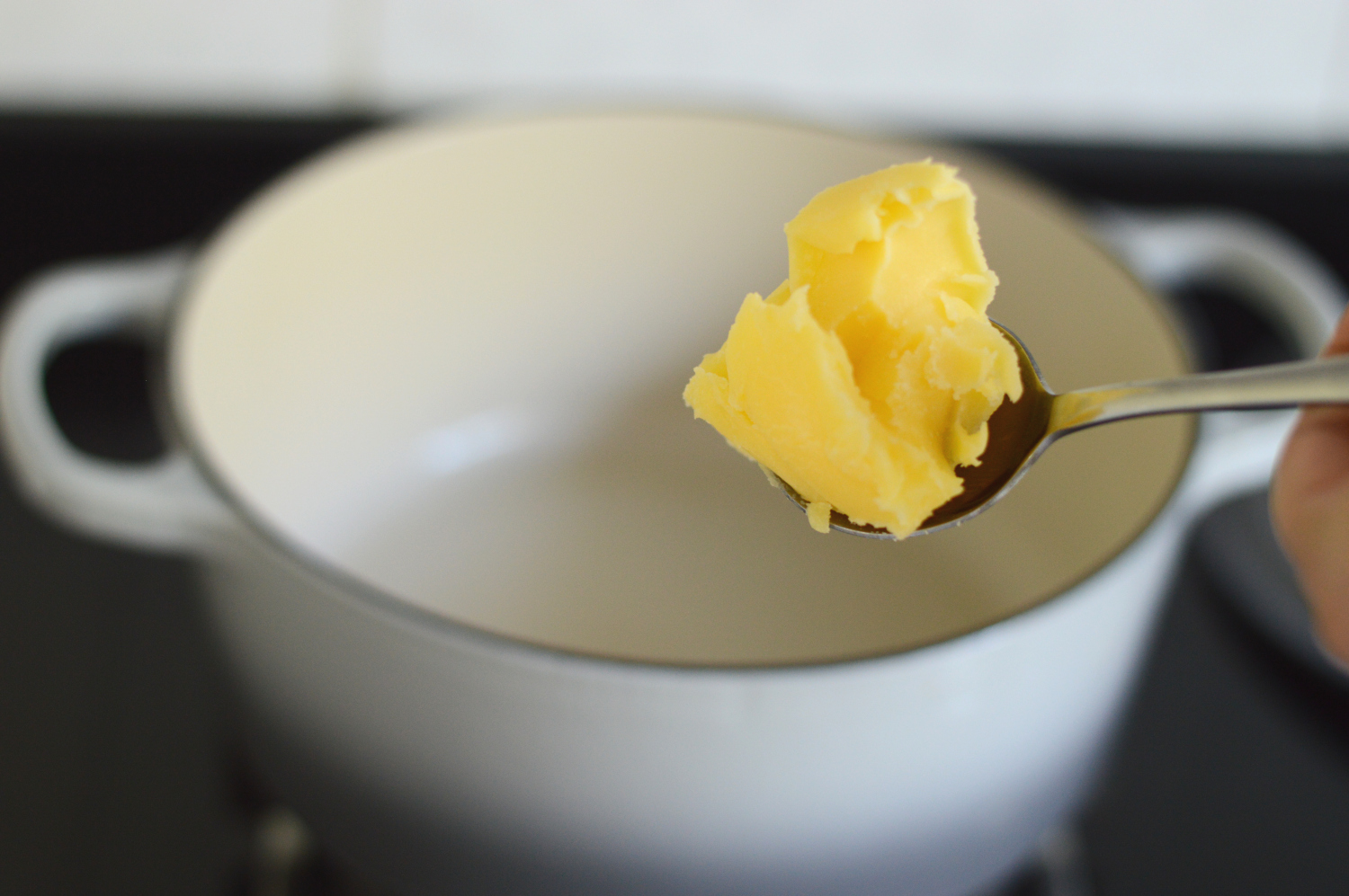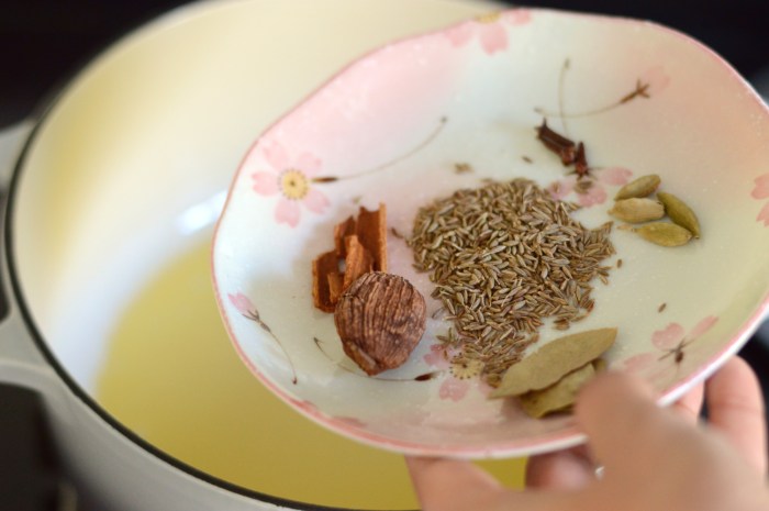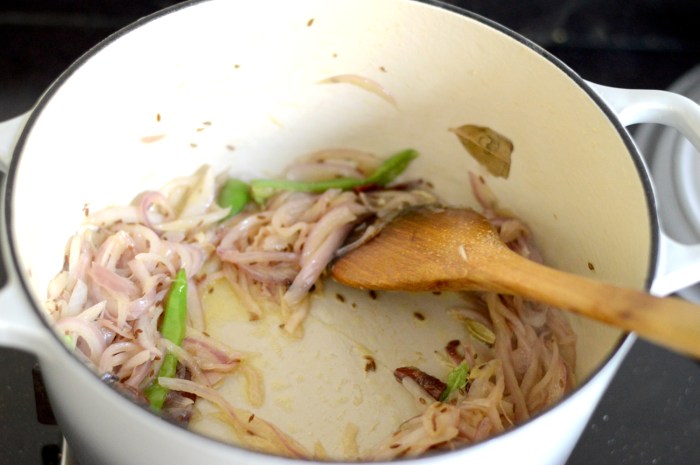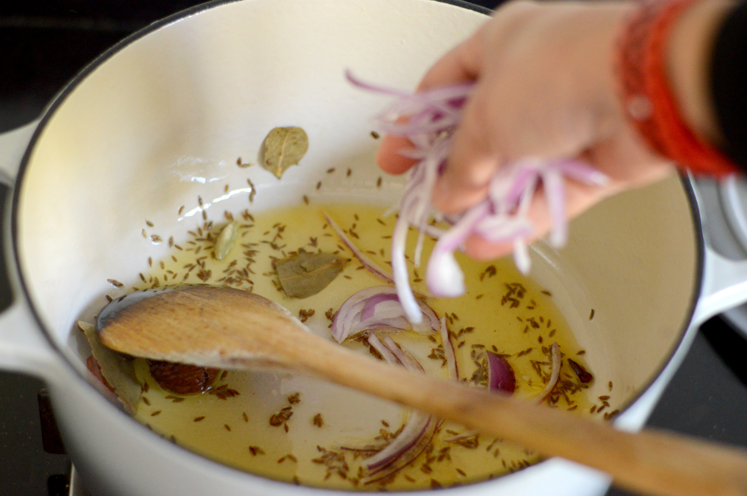 In a large pot on medium flame heat the ghee and add in the spices just as the ghee melts. Stir them together until fragrant and add in the sliced onions and green chilies with some salt. Cook the onions until softened and just beginning to turn golden.