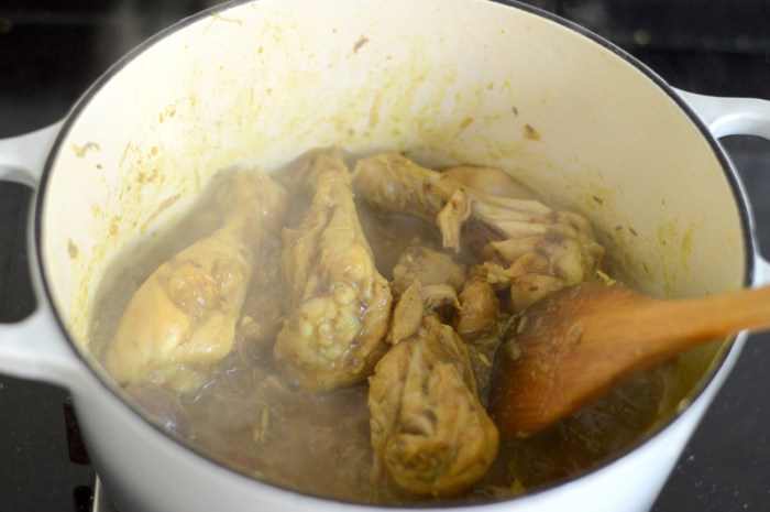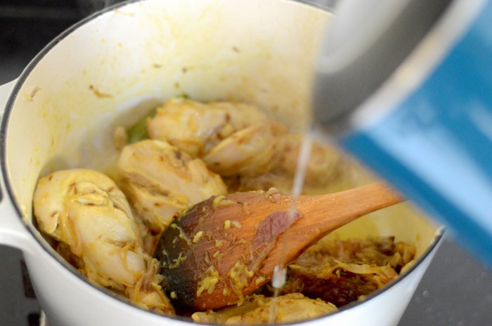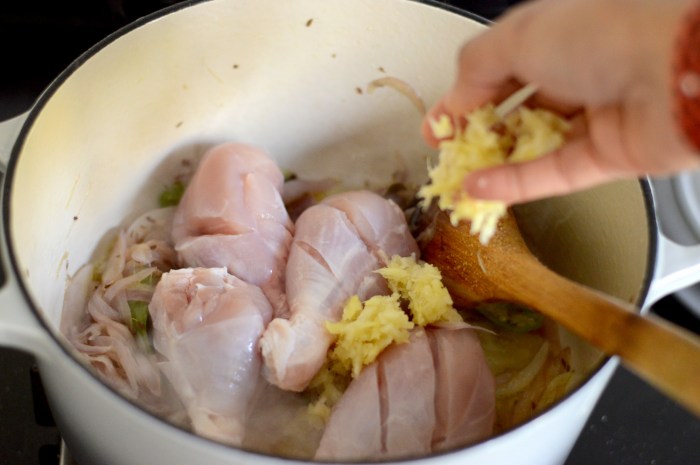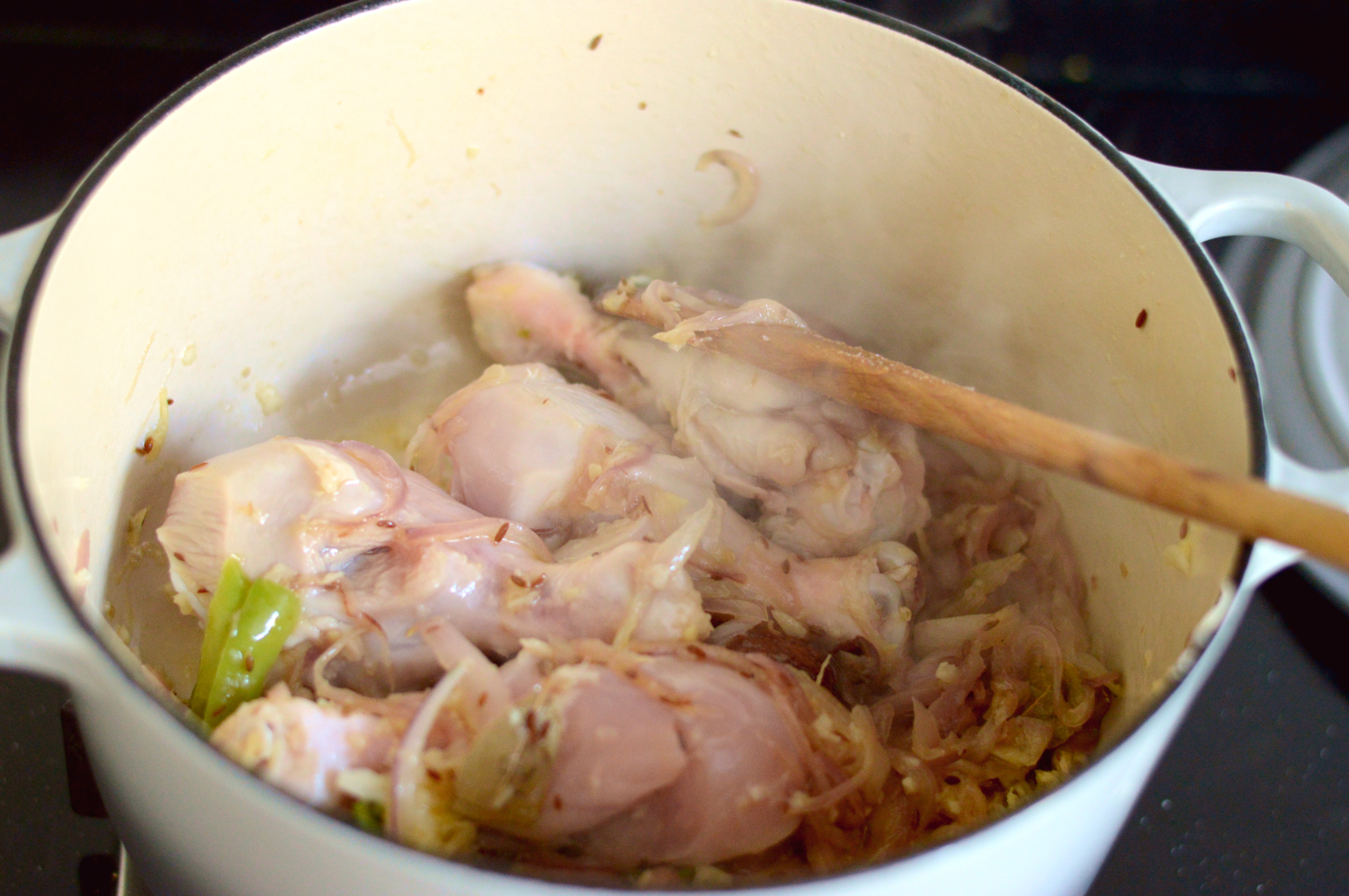 Just as the onions get a slight tan add in the chicken pieces and the ginger garlic.