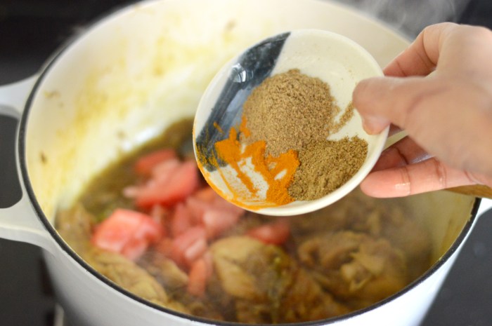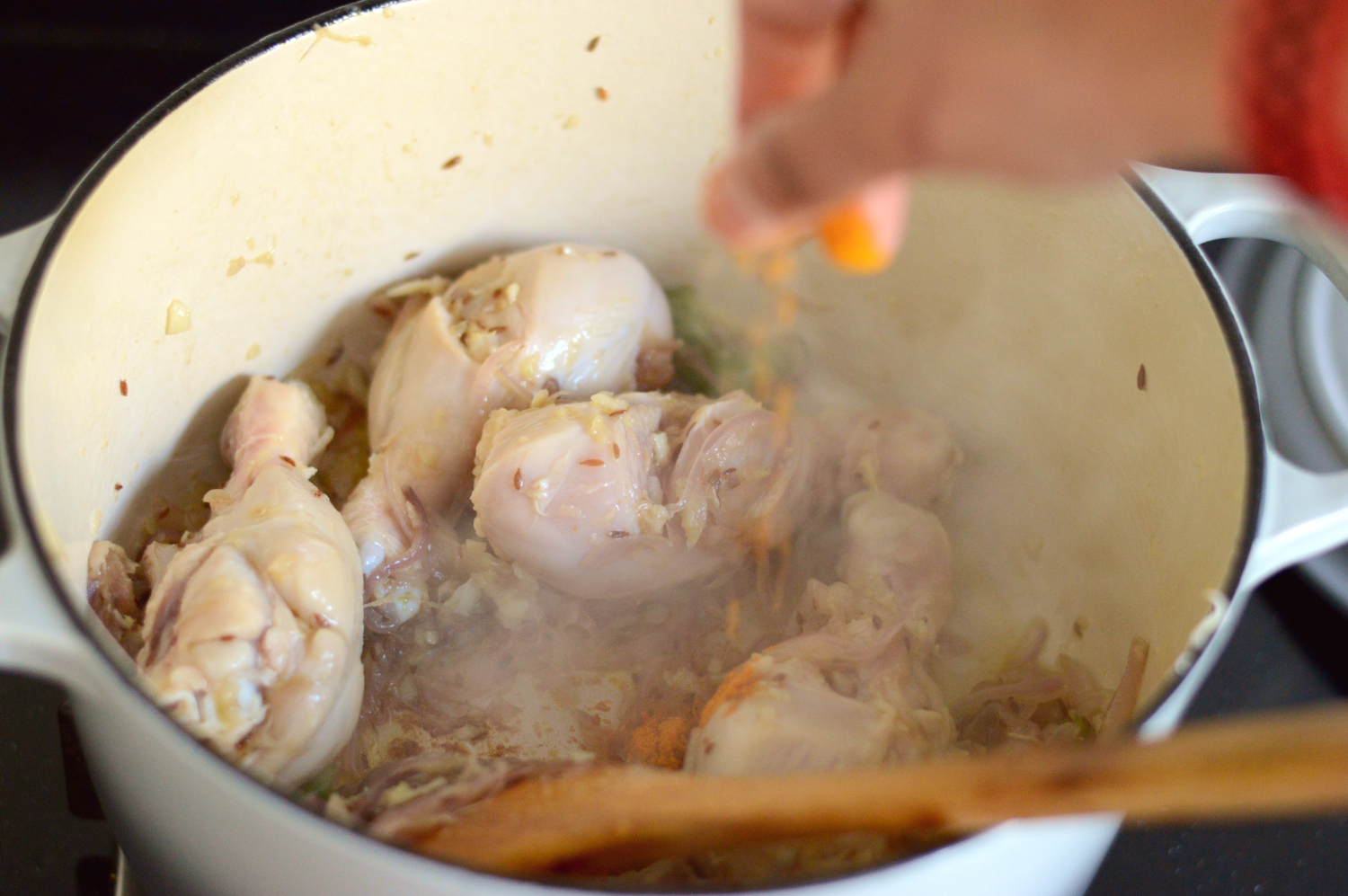 Add in the chicken pieces with ginger garlic and turmeric. Stir and cover the pot and let it cook down for about 5-8 minutes on medium low flame. Add some water if necessary and keep checking to ensure that nothing burns. This step will not only cook the chicken but also fuse its flavours with the spices.