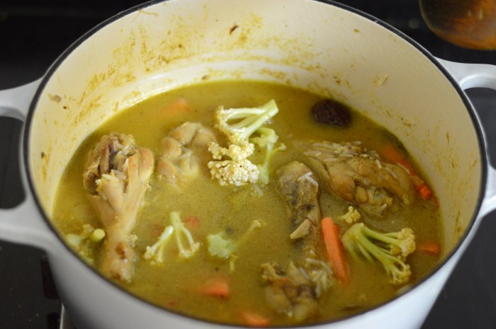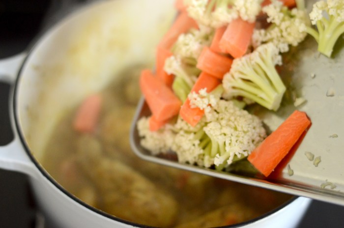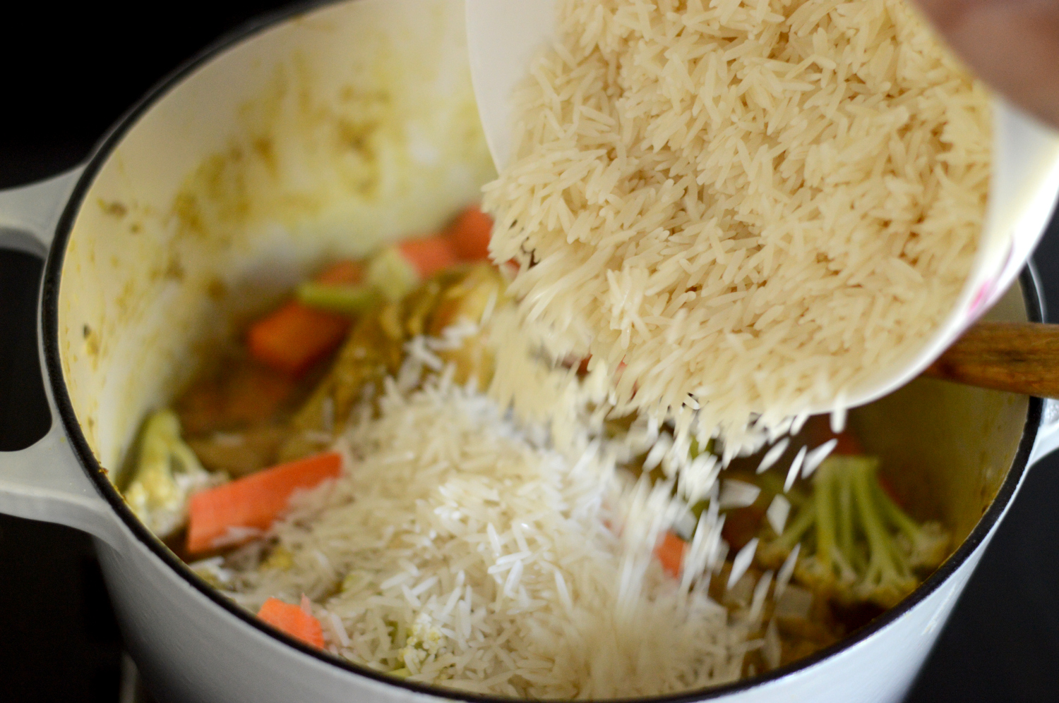 Now add in the vegetables, soaked rice, some more salt and water. Let it all come to a bubble before slowly cooking it all covered on a very low flame for about 10-15 minutes.