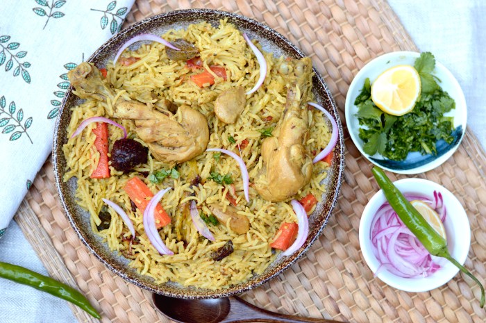 The ingredients are bone-in chicken, onions, tomatoes, ginger-garlic, green chilies, vegetables of choice, yoghurt, coriander powder, turmeric, salt to taste, garam masala, black cardamom, cloves, green cardamom, cinnamon, cumin seeds, bay leaves and rice.