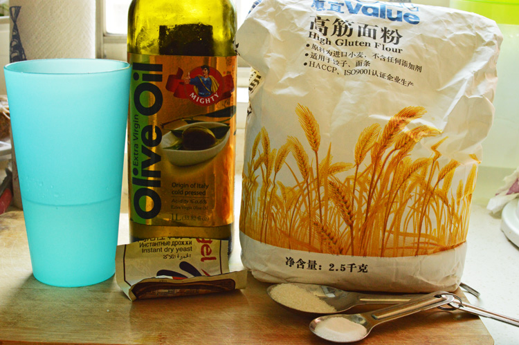 As all breads go, focaccia also begins life with flour and yeast and so here we have bread flour, tepid water, olive oil, yeast, salt, rosemary and olives.