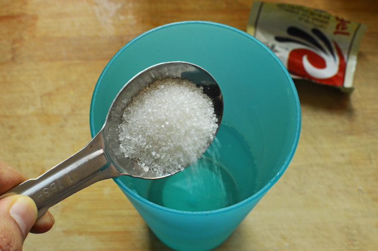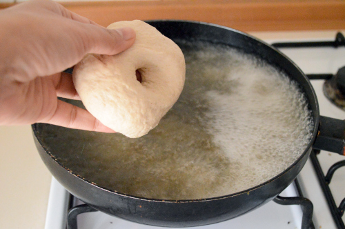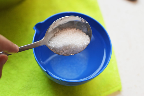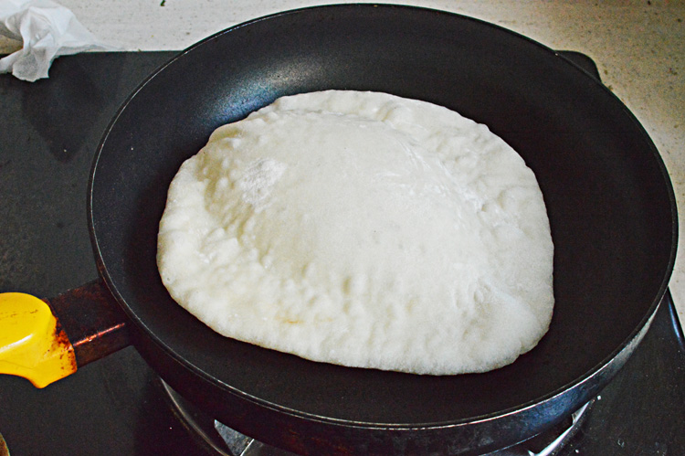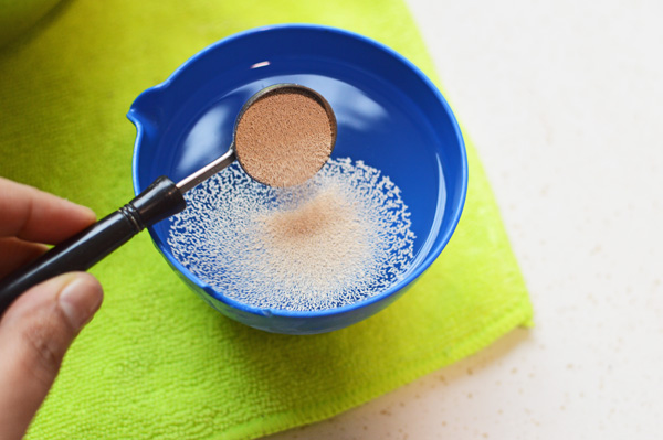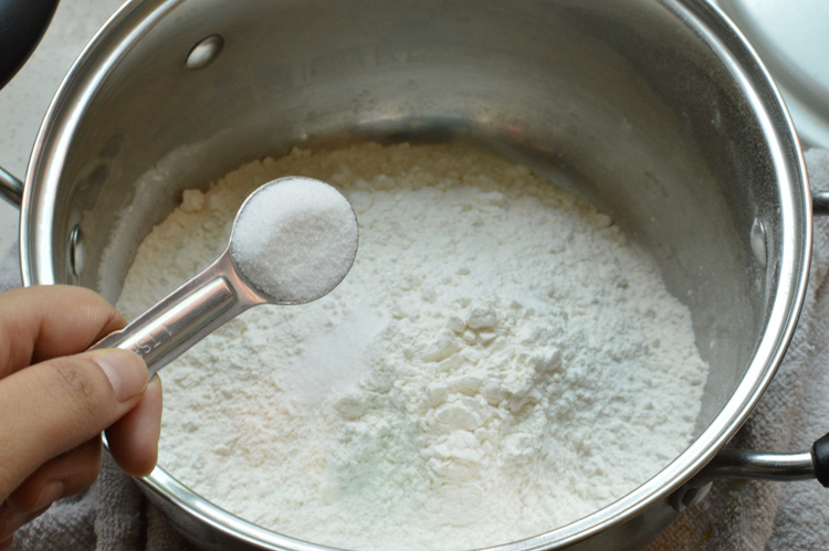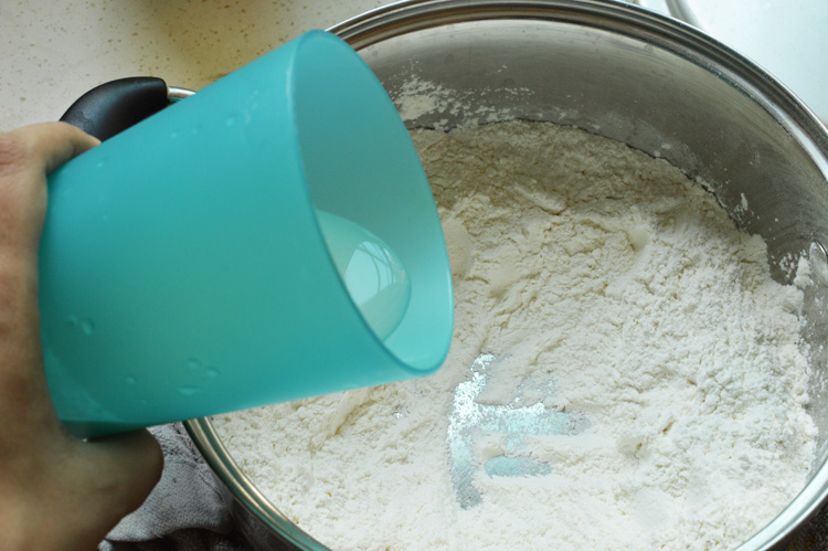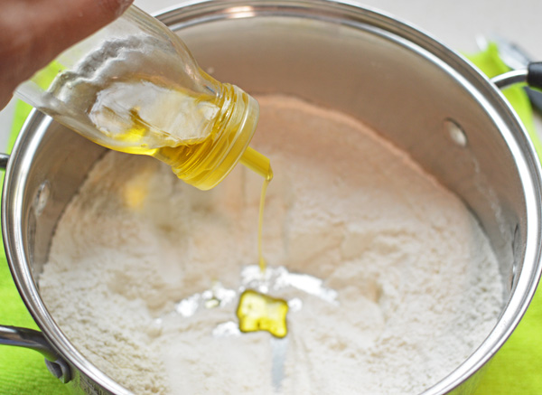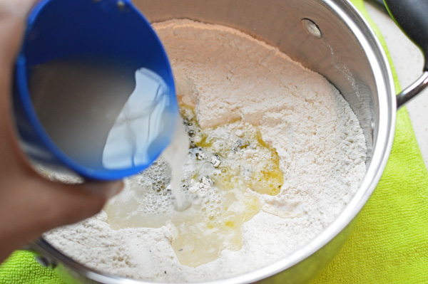 Begin by adding yeast into the water which is just warm to the touch and let it sit until it foams. You need good, fresh yeast for that or else the dough won’t rise.