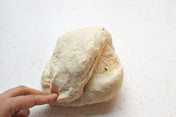 Add the water to the dough along with olive oil and salt and mix with spoon until just combined to form a shaggy dough.