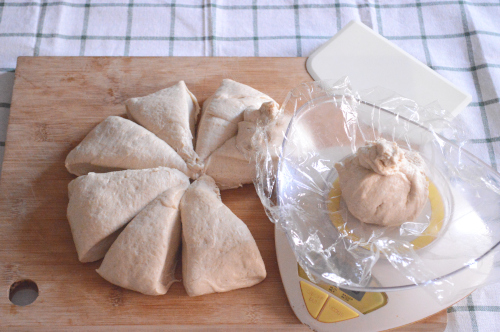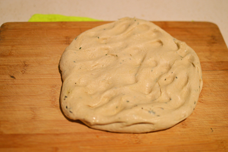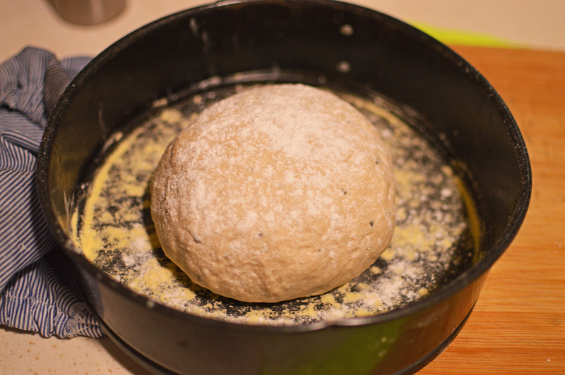 Once the dough had doubled in size, deflate by punching and scrape into a well oiled baking tray sprinkled with semolina.