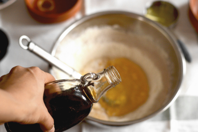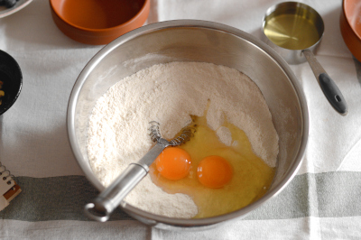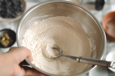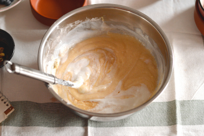followed by four and baking powder. Mix enough to incorporate the flour into the batter without overmixing it.