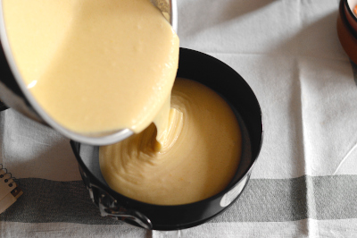 Pour the batter into a baking dish, top with the banana halves and bake at 170ºC for 35-40 minutes or until a toothpick inserted in the centre of the cake comes out clean.