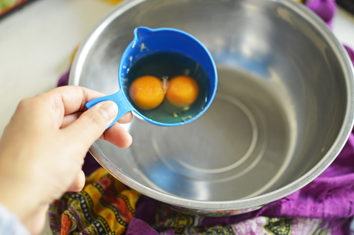 crack in the eggs. one at a time and beat after each addition to mix thoroughly, so here’s the first