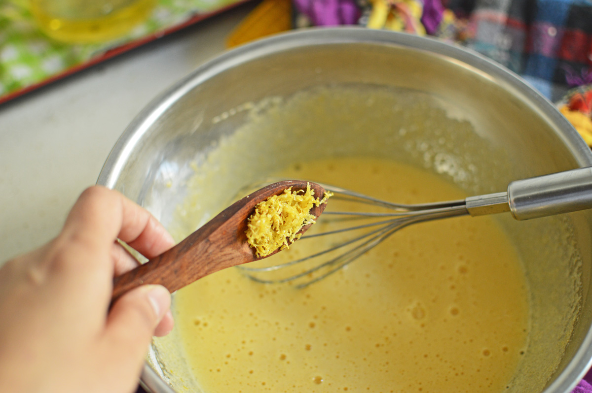 this is a citrus cake and we want every breath to speak of it, which is why into our sugar we mix in the lemon zest
