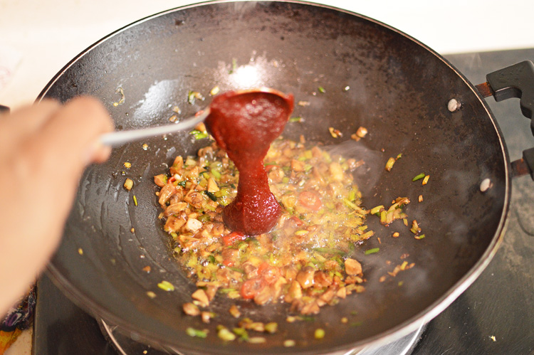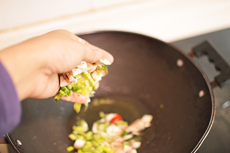 Heat two tbsp oil in a wok/pan and add in the chopped ginger, garlic and green onions. Cook until translucent and add in the mushrooms. Saute for a minute, add a few strands of coriander and add in water/stock. Sprinkle salt if needed.
