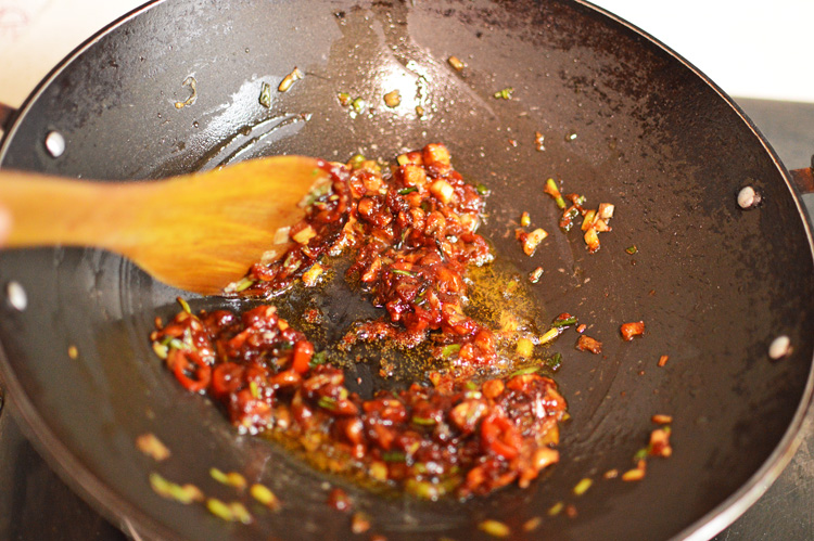 In a pan or wok of choice, heat some oil and add the chopped/minced ginger+garlic+white part of green onions.