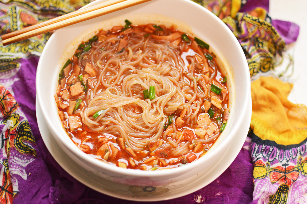 This isn’t the first noodle soup recipe on this blog, and most assuredly, not the last; this however is (as immodest as it may sound) the alpha and the omega of soupy noodle world. Meatless magic in all its crimson glory. The red blush that stains this fantastic broth is courtesy ‘Gochujang’; that vividly red Korean paste of hot peppers, easily available at your nearest Asian grocery store.