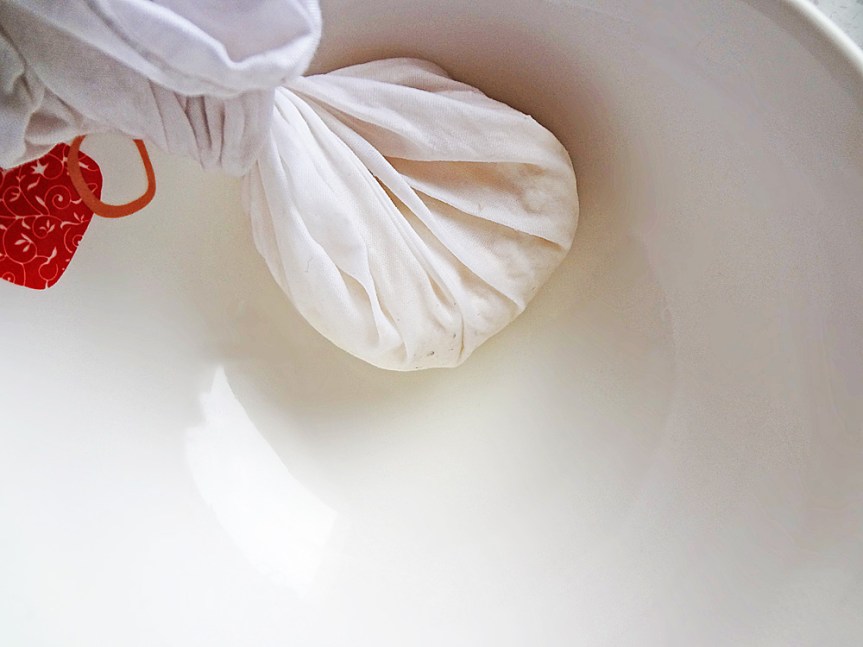 You can see the whey is separated. Discard it and put the cloth back in try squeezing it out once it has cooled down a bit, this is very very hot right now. You can even hang it and let all the whey slowly drip out, if you have the time. I’m impatient and I always burn my palms.. but such is life.