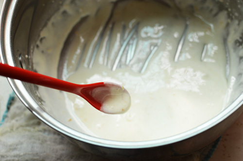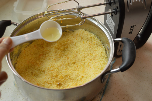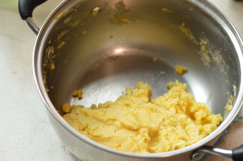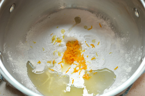 Cream the butter (make sure the butter is at room temperature), add in the sugar and egg yolk. Beat again to mix and add in the zest and the flour. Beat until it’s more or less mixed and finally add in the juice and beat to combine.
