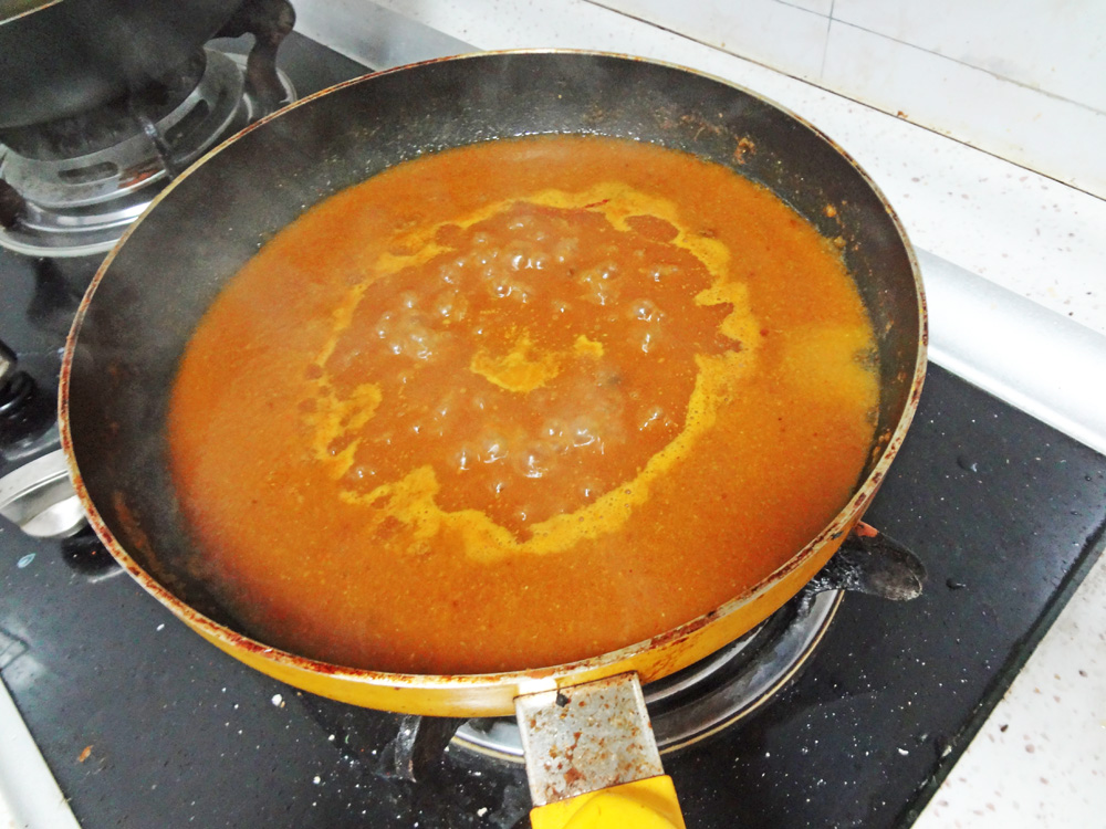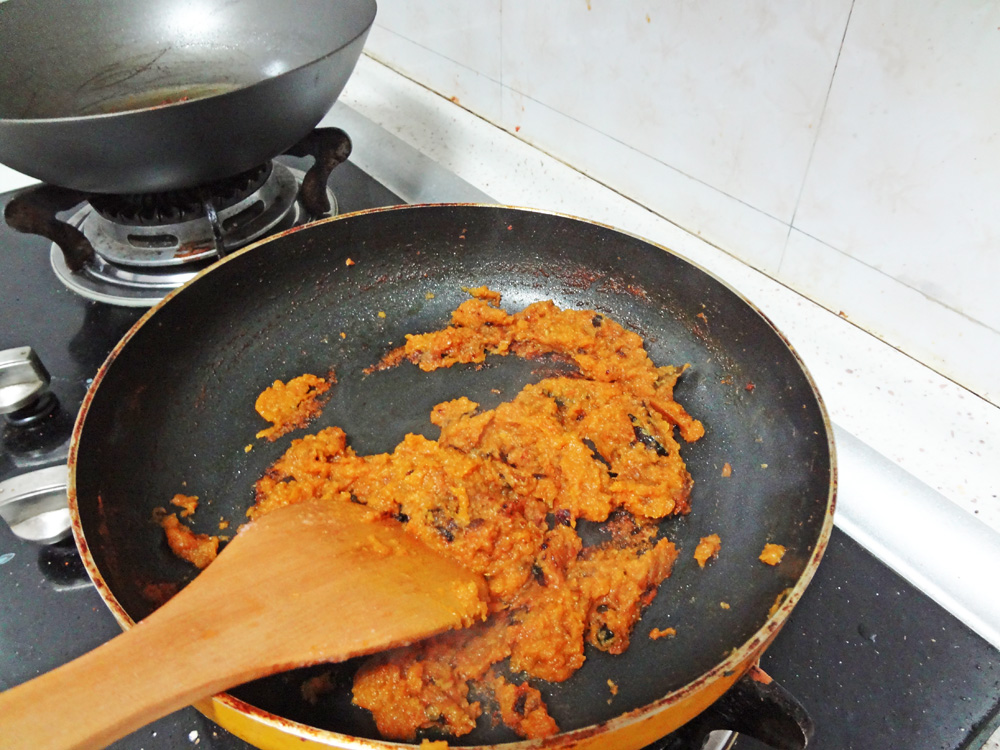 In the meanwhile, we have the onion, garlic and ginger puree now cooked and ready for the grated tomato pulp to be added in.